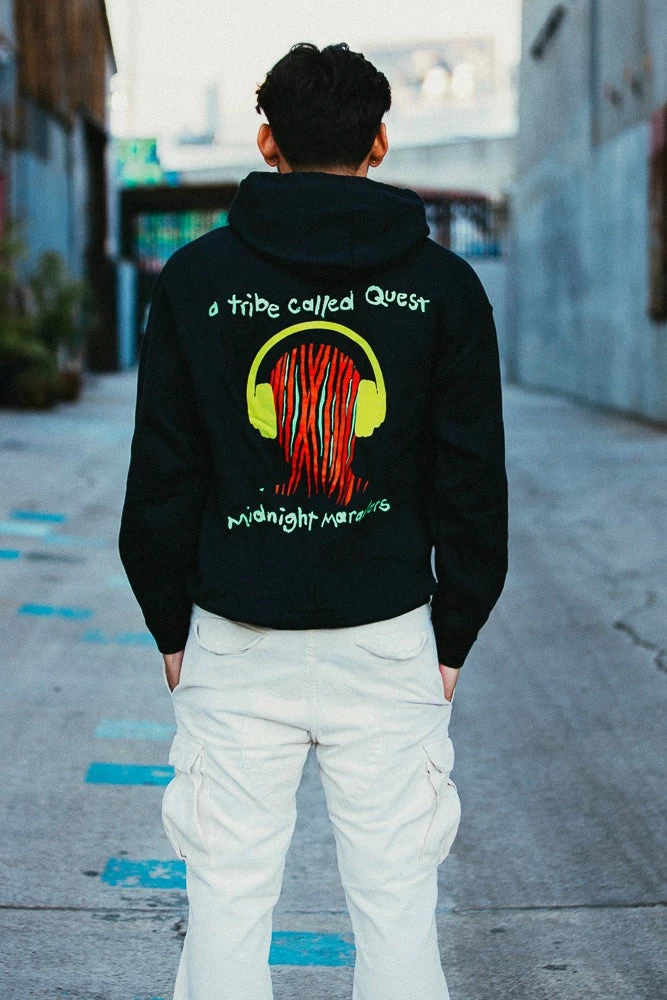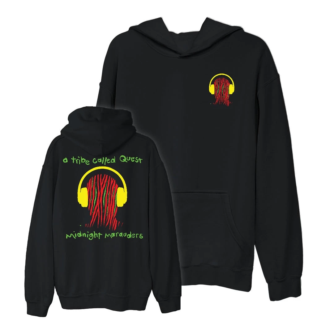 Official licensed A Tribe Called Quest Marauder Hoodie with red, black and green person listening to headphones on the left chest and larger image on the back.
