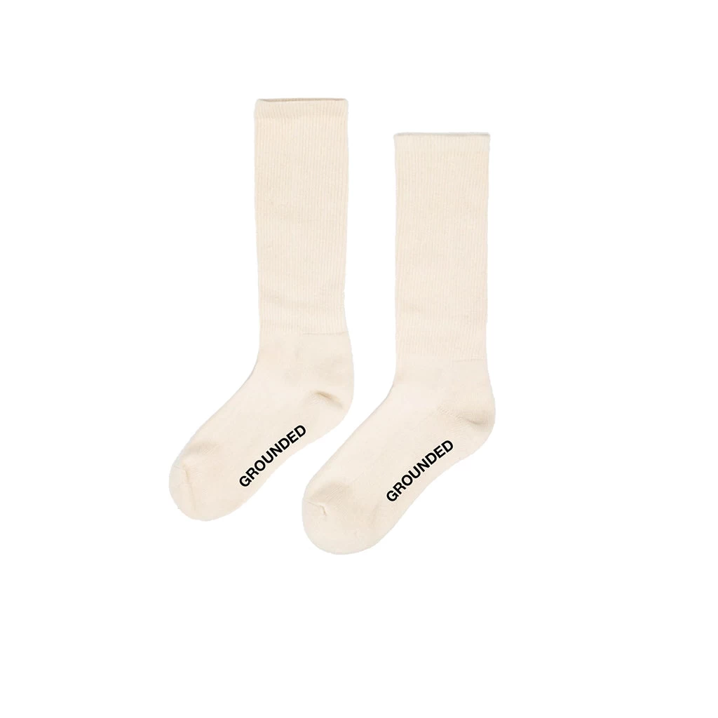 Akomplice reminds us to stay grounded. Organic cotton socks creme socks with “Grounded” near the foot bed. Carbon neutral production.
