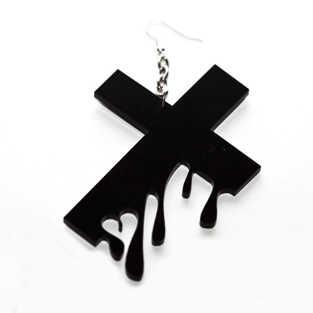 Beautifully laser cut and etched black lucite dripping CROSS one-ear earring. 3″ tall.