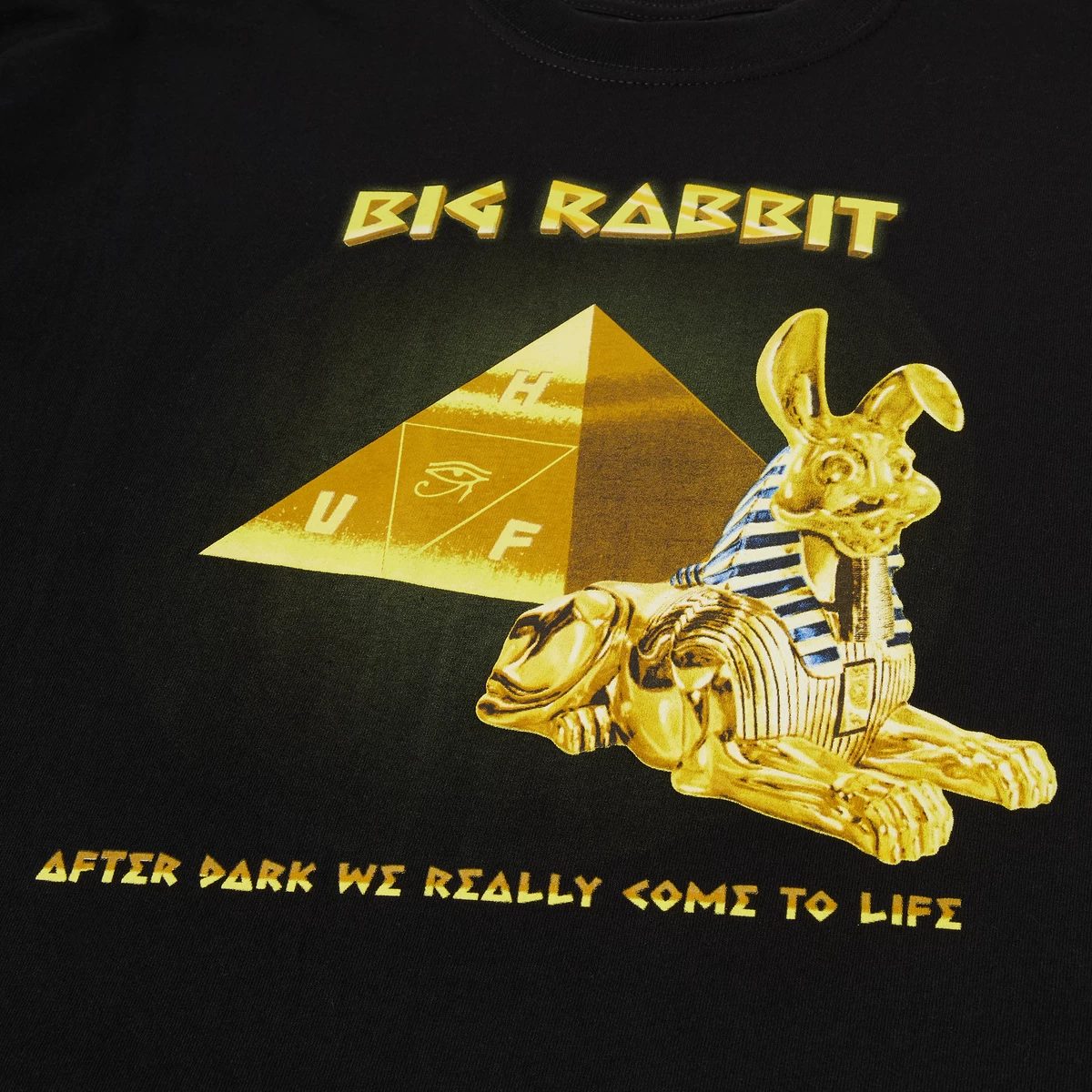 HUF x Freddie Gibbs special edition collaboration that pays homage to the versatile rapper. Features golden sphinx Big Boss Rabbit artwork and a classic HUF pyramid on a black tee.