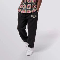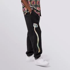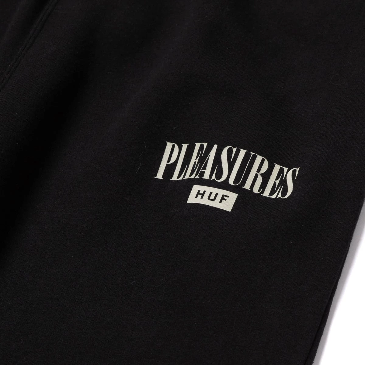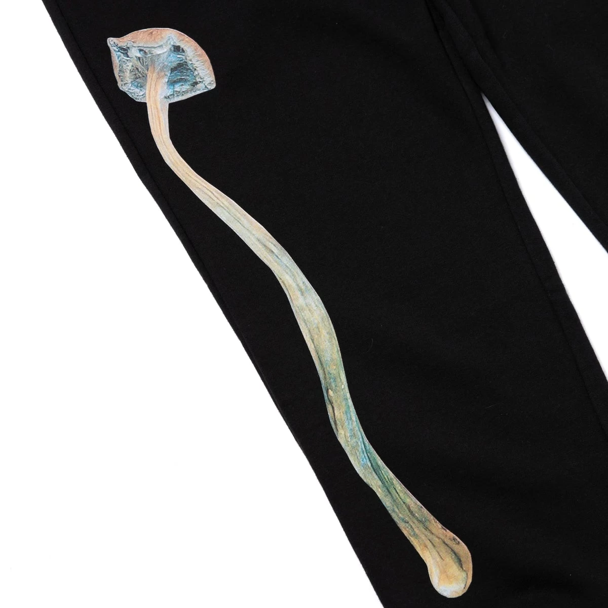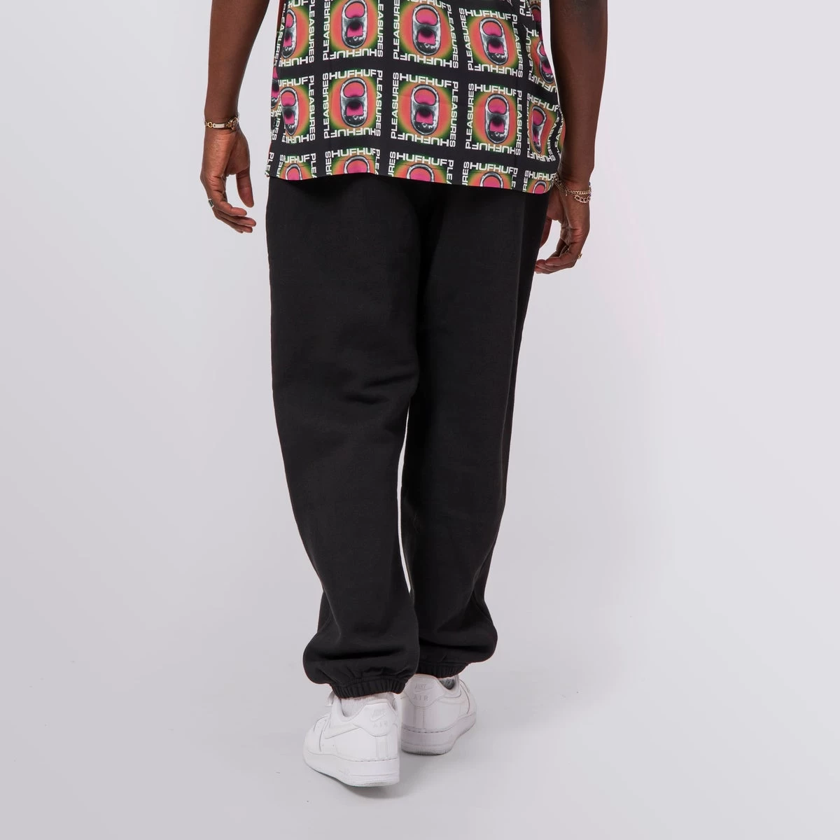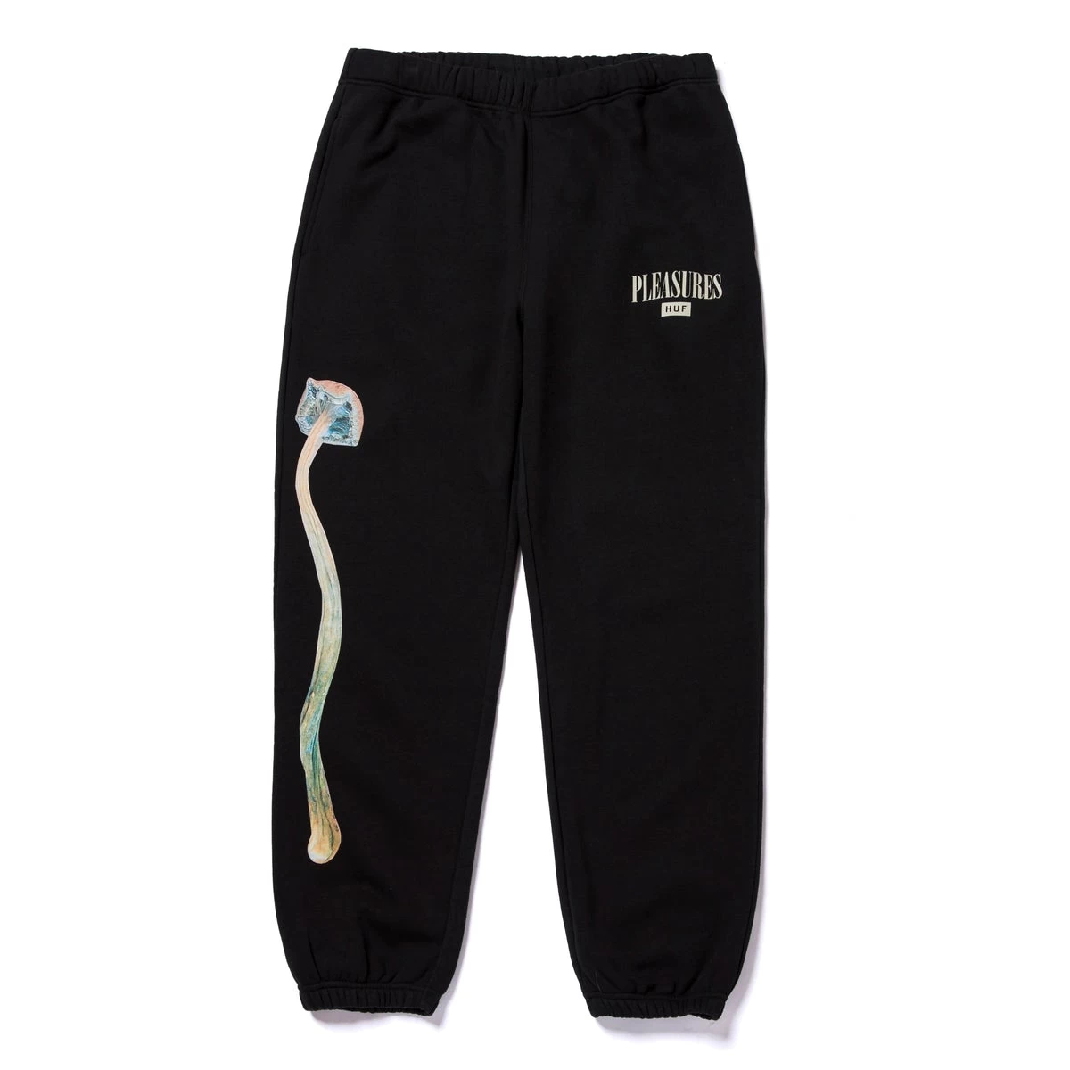 HUF x Pleasures limited edition collection celebrates the nostalgia of the 1990’s. Regular fit super soft fleece pants with elastic waist. Features an oversized magic mushroom down the right leg and a logo lockup on the left thigh. Two side seam front pockets and one back patch pocket.