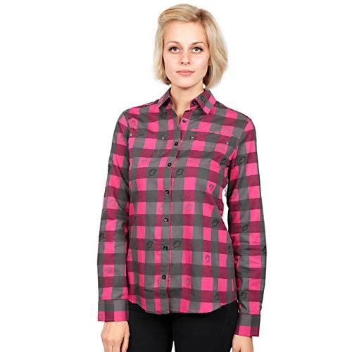 Long sleeve plaid buttoned-down shirt featuring an all over fabric pattern design. Custom buttons through out with two front side pockets at chest. Married to the Mob embroidered detail above the front left side pocket.