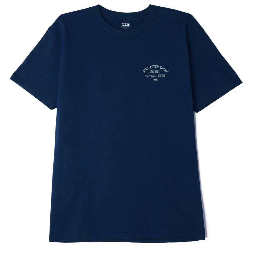 “OBEY After Hours, City’s Finest, The Dead Of Night Club”. Classic navy tee with custom Fairey design on the back and small left chest “OBEY After Hours” print. Regular fit classic tee in heavyweight cotton jersey.