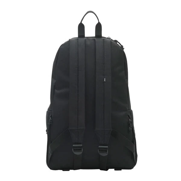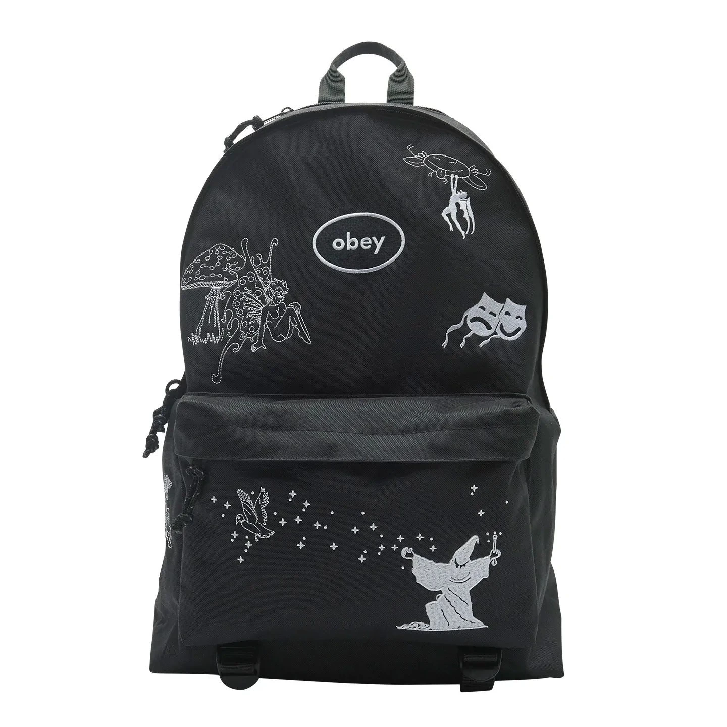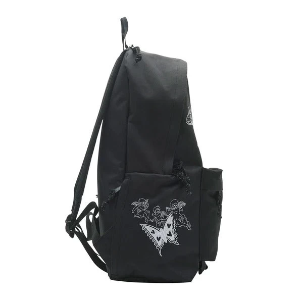 Classic black backpack with custom embroidered graphics. Large main zippered compartment and interior laptop sleeve. Features front zippered pocket, compartment near woven top handle, and padded shoulder straps.