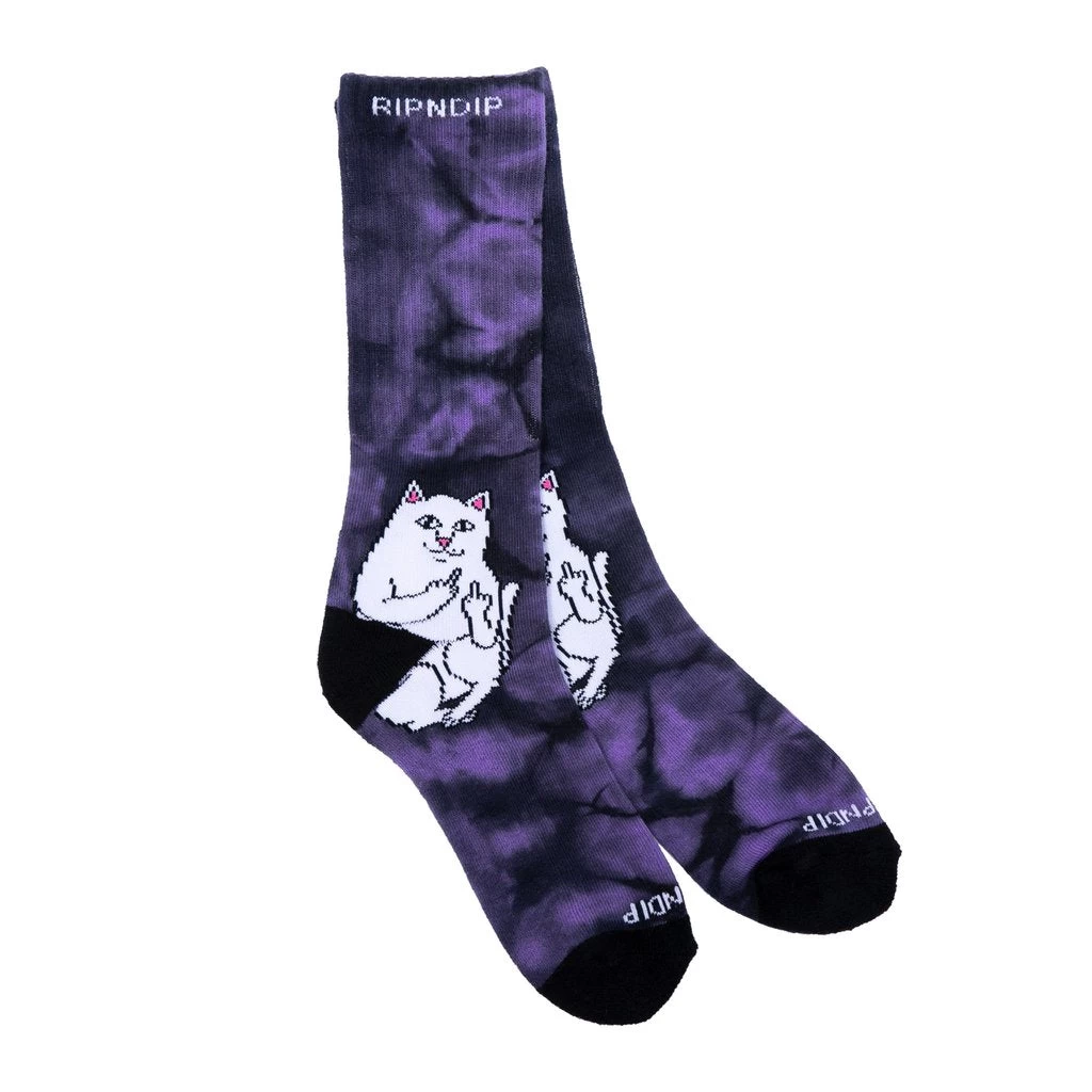 Jacquard knit pattern with double layer heel and toe in trippy tie dye. Features Lord Nermal on lavender tie dye socks.