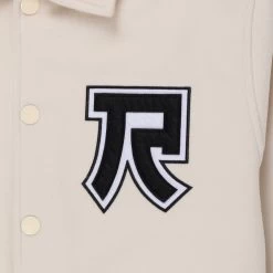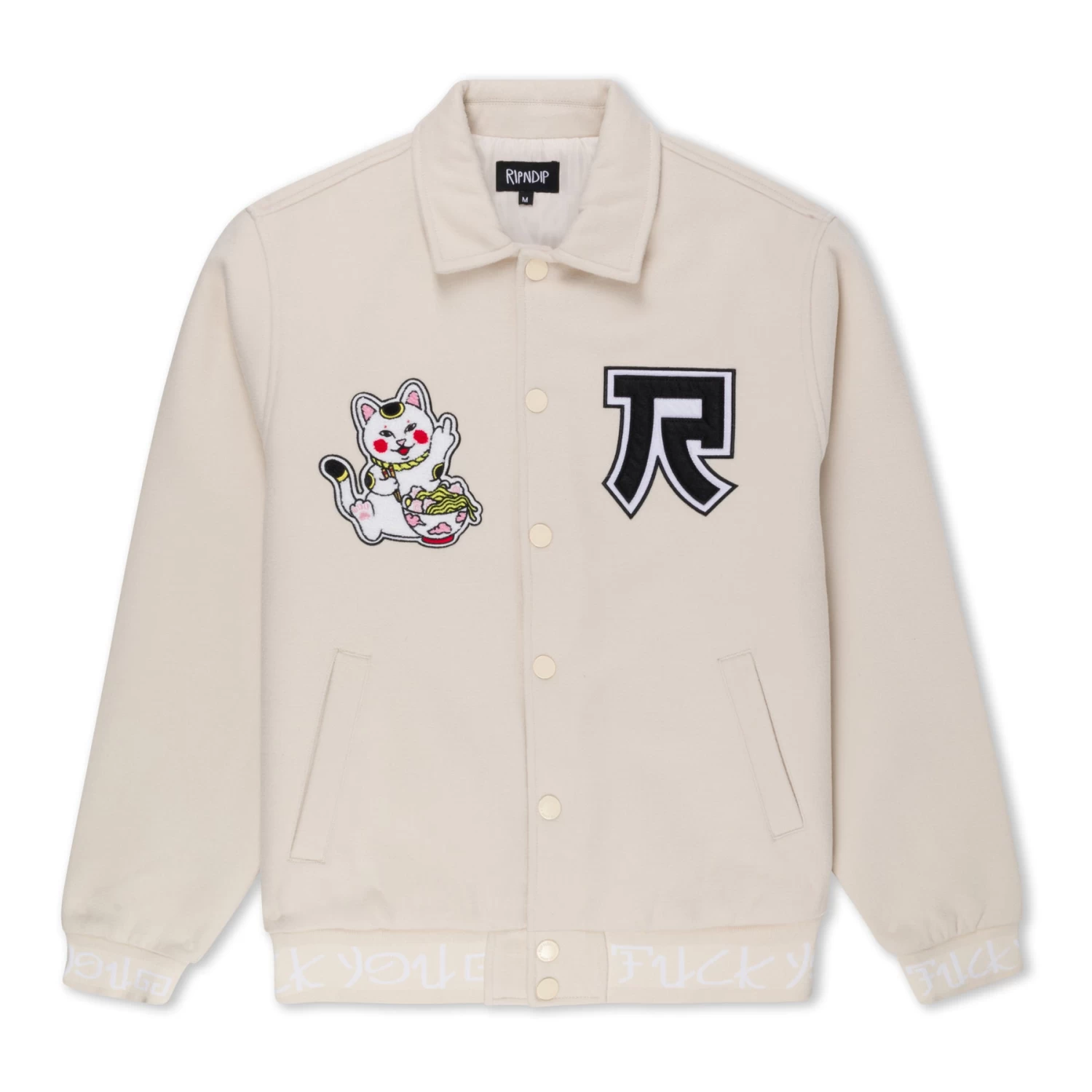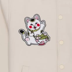 Nerm as Maneki-neko Lucky Fortune Cat on a custom cream varsity jacket. Chenille patch artwork on the chest and back, button front, and welt pockets.