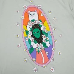 Together Nermal and Alien create a colorful work of art. Features Nermal and Alien against the backdrop of a rainbow tiles and daisies. RIPNDIP logo with daisies on the left chest of a pale sage tee.