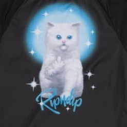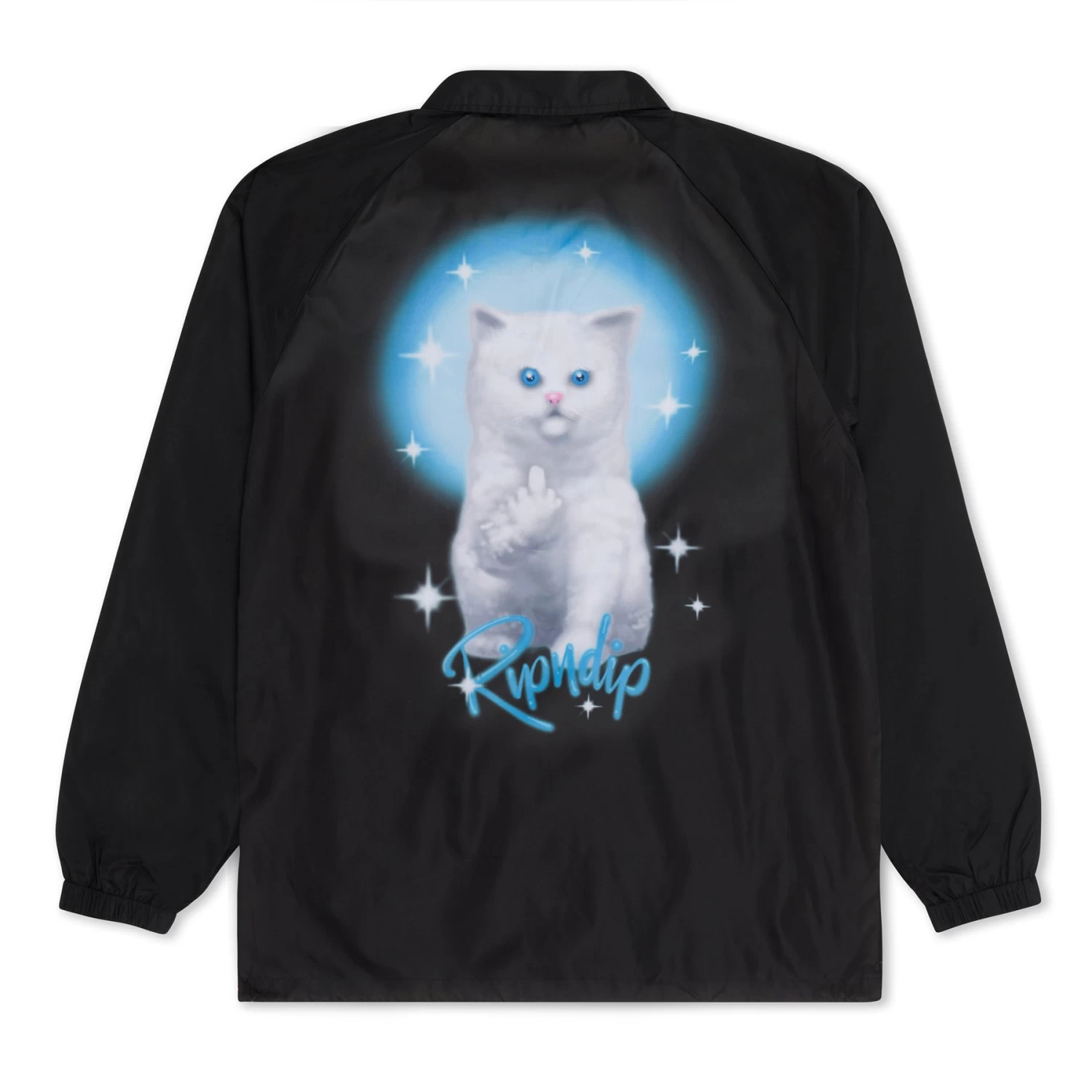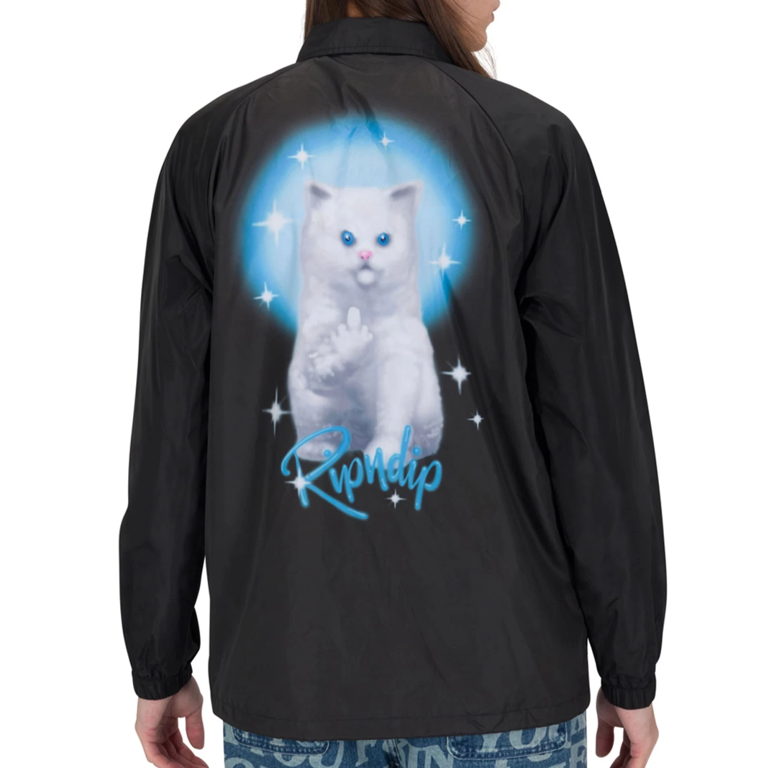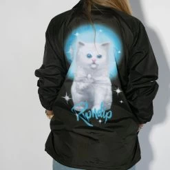 Custom airbrushed look on a black coaches jacket. Features left chest logo, Nermal flipping the bird on the back, and “We Out Here” inner liner graphic. Button front jacket with two front welt pockets.