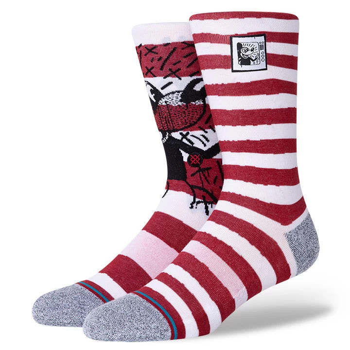 Stance teams with the estate of Keith Haring for a collection of socks based on Haring’s drawings of Mickey. This pair features two different red and white striped socks. One has larger stripes and a large image of Mickey. The other has thinner stripes and a small image of Mickey in a TV.